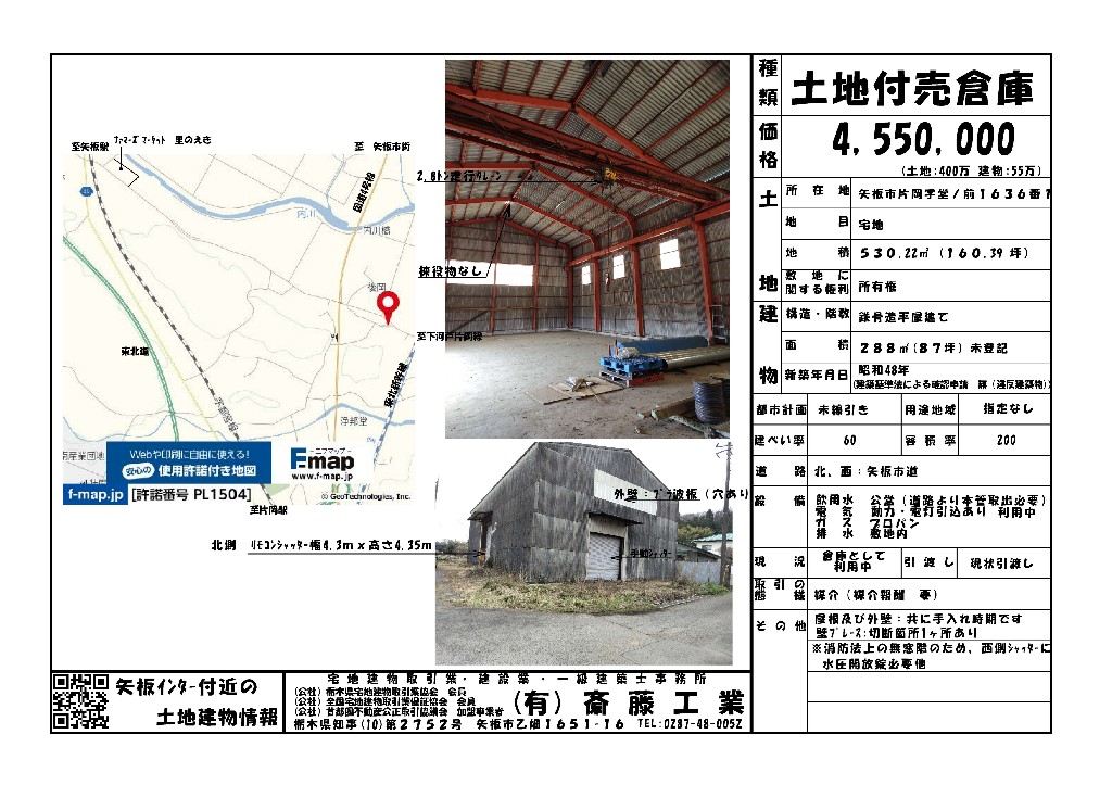 片岡1636-1 売倉庫 投稿日時: 2025-12-09 (1024 × 723) ギャラリー名: 片岡の売倉庫(矢板インターから約3.8km(県道141経由)築52年の売倉庫) 値下げしました。 ツイート